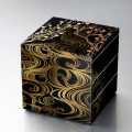 日本の伝統美、香琳の柄を丹念に描いた、職人技が際立つ三段重。中外 しっとりとした黒の落ち着いた重箱は、永くお使い頂ける飽きのこない逸品です。